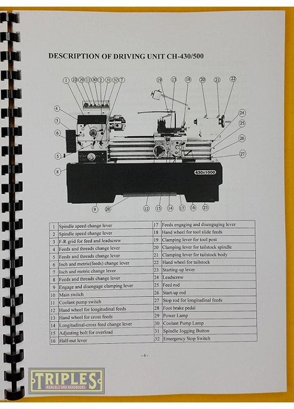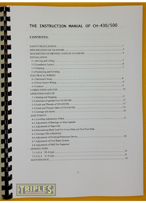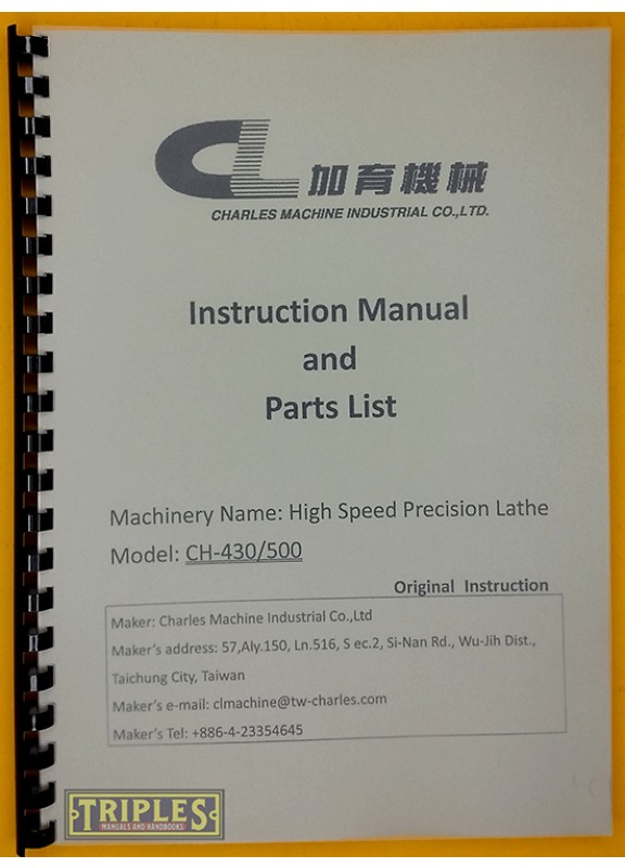 Charles Machine Industrial. CH-430 CH-500 Lathe Instruction Manual and Parts List.